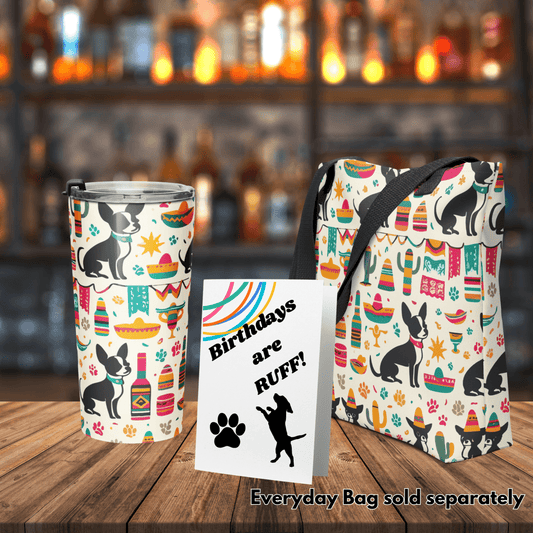 Bursting with vibrant colors and festive charm, this lively design captures the spirit of celebration with playful Chihuahuas, sombreros, and a fiesta-ready vibe.