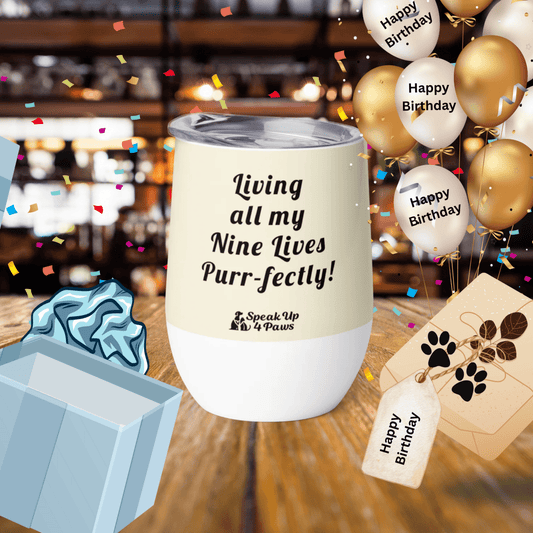 "Living all my Nine Lives Purr-fectly!" - Wine Tumbler | 12 oz.